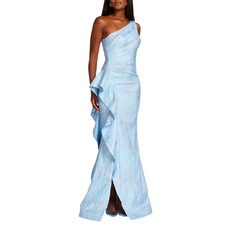 This gorgeous one shoulder evening dress will be the center of attention of every room! This dress features a statement side ruffle and ruching along the bodice that hugs the figure in all the right ways. The sky blue jacquard fabric elevates the already flattering silhouette of the gown.