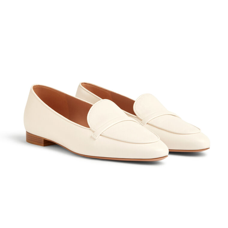 Bruni mixes classic elegance with easy wearability. Embodying a metropolitan sense of style, Bruni is a new take on the women's loafer. Crafted this season from off white nappa leather, it holds enduring appeal. A low vamp and short heel give it undeniable charm, while an almond toe is crossed by Malone Soulier's signature strap detail.