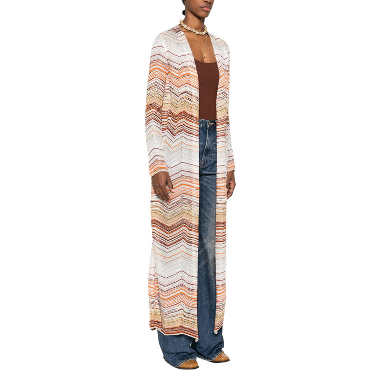 This long lame chevron cardigan is the perfect fusion of luxury and comfort, with a shimmering effect created by the sequins that run through it. The decorative lace adds a refined touch, while the enveloping and fluid silhouette reflects the savoir-faire of the Missoni maison. A versatile and unique garment, capable of enhancing any look with luminous elegance.
