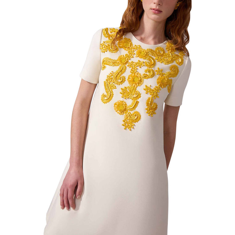 This A-line mini dress elaborates a flirty silhouette with exquisite embroidery in raffia, beads, and sequins. Concealed zip fastening at back.
