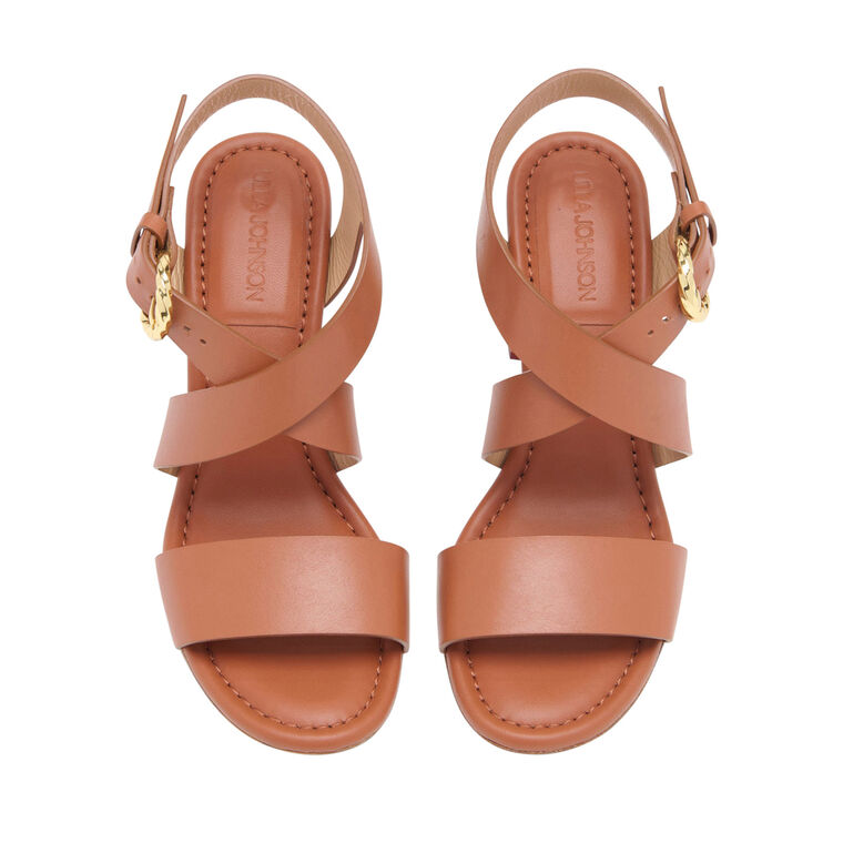 Featured on the SS25 runway, the new Elora is adorned with a transparent, 85mm lucite heel that reveals the internal hardware for a touch of utilitarian elegance. It is crafted from supple brown leather with wide, crossover straps and fastens with a new twisted buckle in shiny brass.